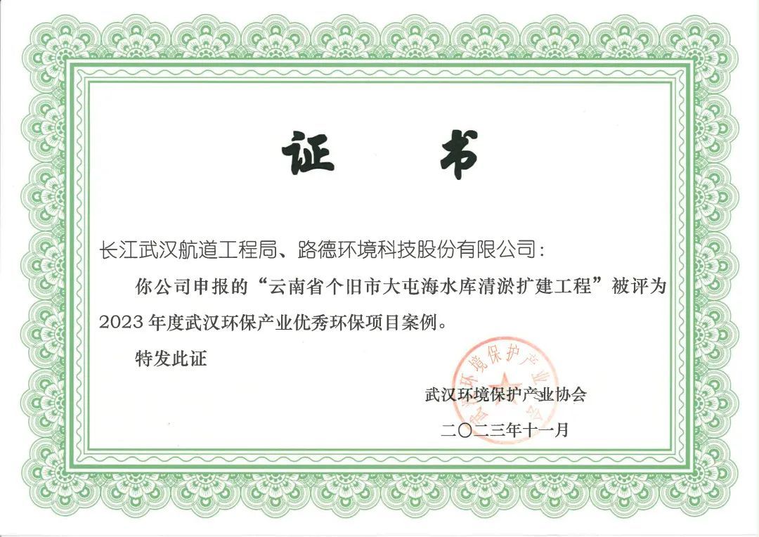 公司“云南省個舊市大屯海水庫清淤擴(kuò)建工程”被武漢環(huán)境保護(hù)產(chǎn)業(yè)協(xié)會評選為“2023年度武漢環(huán)保產(chǎn)業(yè)優(yōu)秀環(huán)保項目案例”。