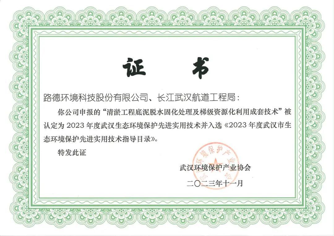 公司“清淤工程底泥脫水固化處理及梯級資源化利用成套技術(shù)”被武漢環(huán)境保護(hù)產(chǎn)業(yè)協(xié)會認(rèn)定為“2023年度武漢生態(tài)環(huán)境保護(hù)先進(jìn)實用技術(shù)”并入選《2023年度武漢市生態(tài)環(huán)境保護(hù)先進(jìn)實用技術(shù)指導(dǎo)目錄》。